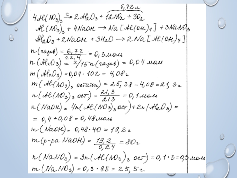 27. При нагревании образца нитрата алюминия часть вещества разложилась. При этом выделилось 6,72 л (н.у.) смеси газов. Масса твердого остатка составила 23,38 г. Остаток полностью растворили в необходимом для реакции минимальном объеме 24 %-ного раствора гидроксида натрия. При этом образовался тетрагидроксоалюминат натрия. Определите массовую долю нитрата натрия в полученном растворе. В ответе запишите уравнения реакций, которые указаны в условии задачи, и приведите все необходимые вычисления.