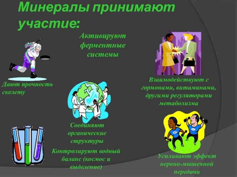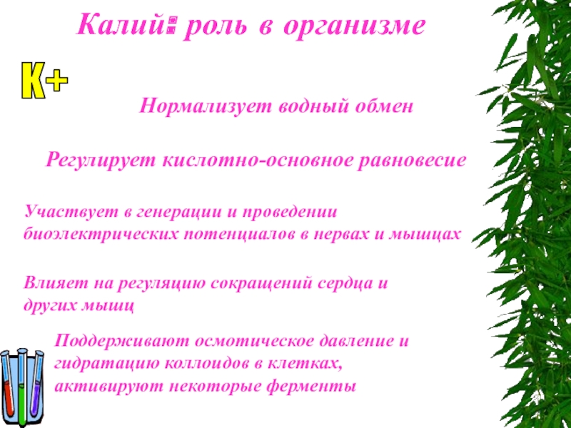 Поддерживают осмотическое давление и гидратацию коллоидов в клетках, активируют некоторые ферменты