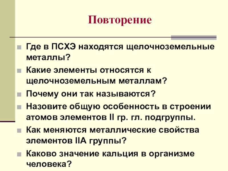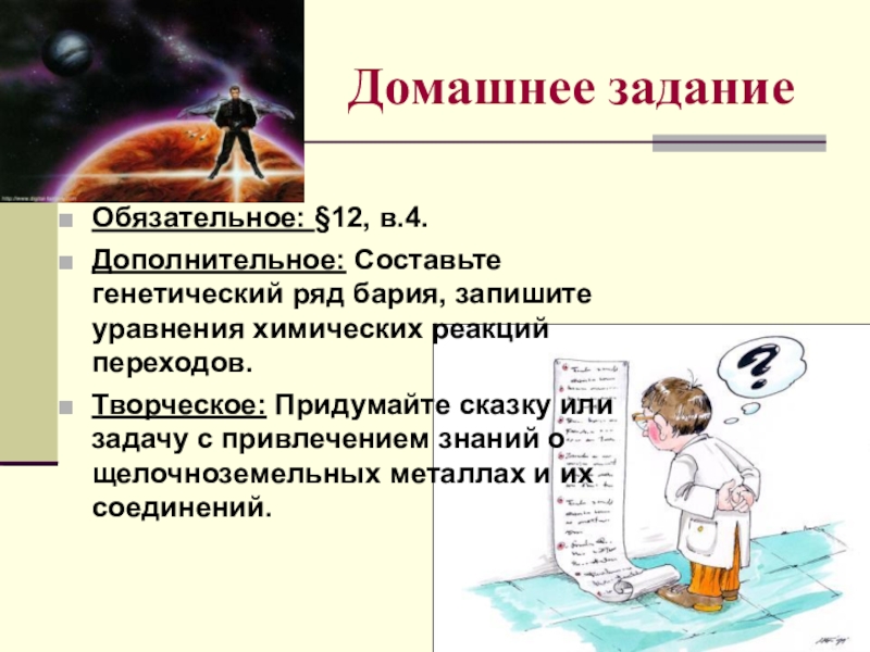 Творческое: Придумайте сказку или задачу с привлечением знаний о щелочноземельных металлах и их соединений.