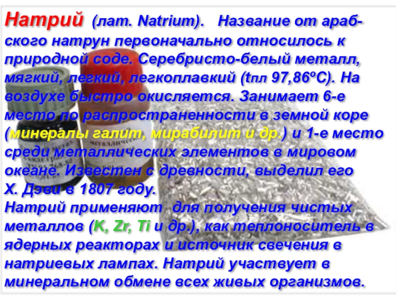 природной соде. Серебристо-белый металл, мягкий, легкий, легкоплавкий (tпл 97,86ºС). На воздухе быстро окисляется. Занимает 6-е место по распространенности в земной коре (минералы галит, мирабилит и др.) и 1-е место среди металлических элементов в мировом океане. Известен с древности, выделил его