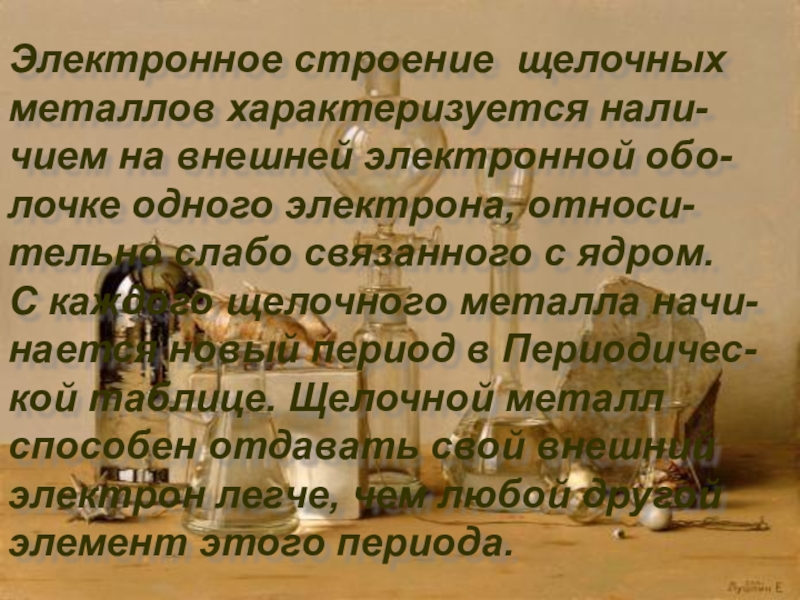 С каждого щелочного металла начи-нается новый период в Периодичес-кой таблице. Щелочной металл способен отдавать свой внешний электрон легче, чем любой другой элемент этого периода.
