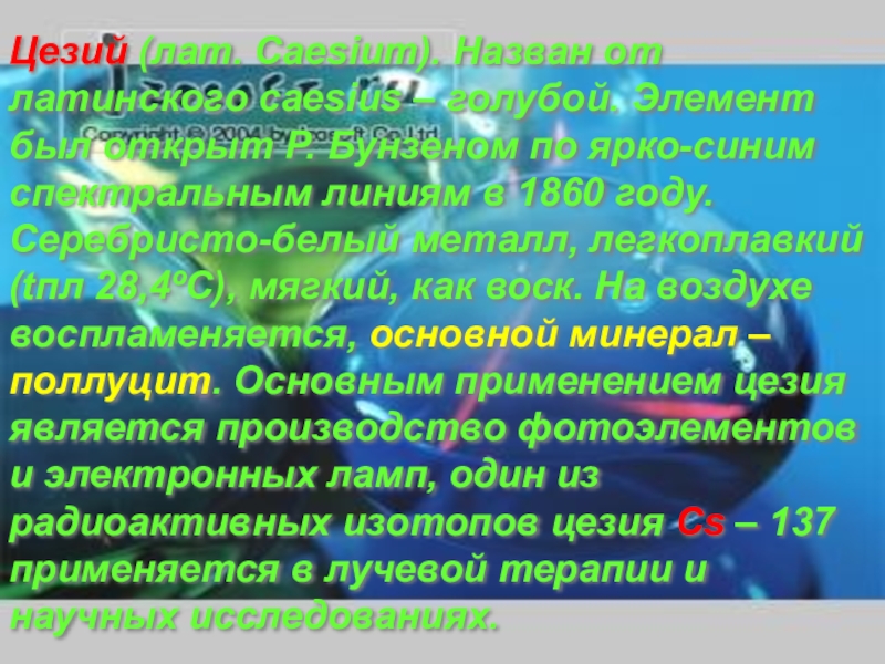 Слайд 11Цезий (лат. Caesium). Назван от латинского caesiиs – голубой. Элемент был