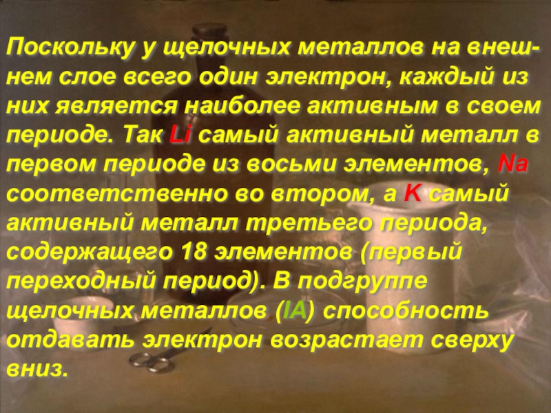 из них является наиболее активным в своем периоде. Так Li самый активный металл в первом периоде из восьми элементов, Na соответственно во втором, а K самый активный металл третьего периода, содержащего 18 элементов (первый переходный период). В подгруппе щелочных металлов (IА) способность отдавать электрон возрастает сверху вниз.