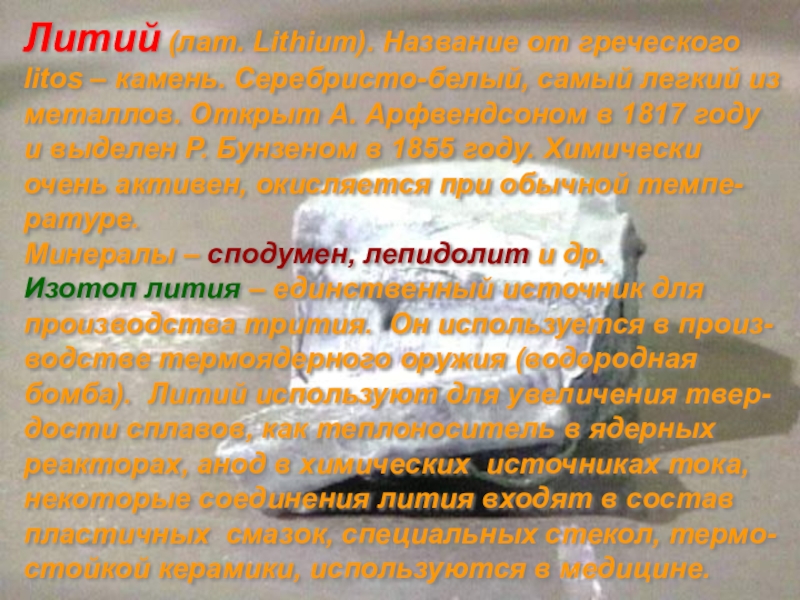 Слайд 7Литий (лат. Lithium). Название от греческого litos – камень. Серебристо-белый, самый