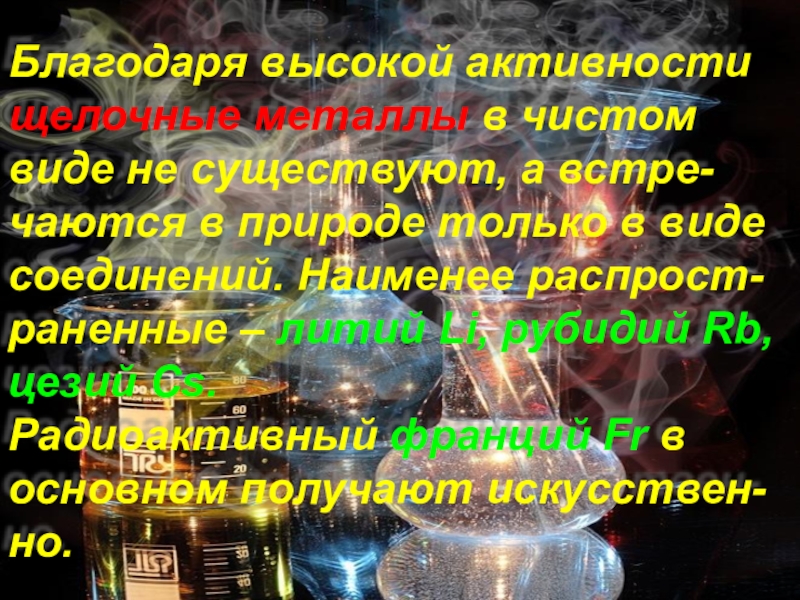 Слайд 6Благодаря высокой активности щелочные металлы в чистом виде не существуют, а