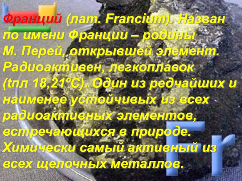 (tпл 18,21ºС). Один из редчайших и наименее устойчивых из всех радиоактивных элементов, встречающихся в природе. Химически самый активный из всех щелочных металлов.