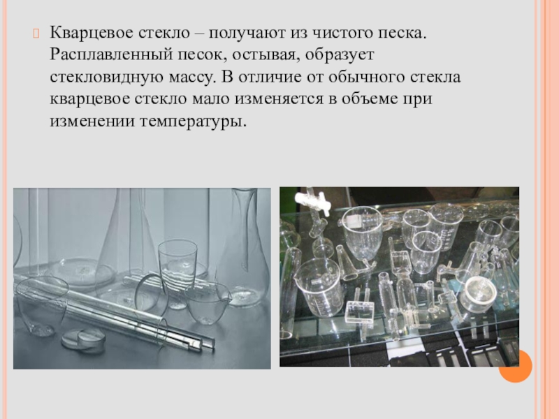 Слайд 15Кварцевое стекло – получают из чистого песка. Расплавленный песок, остывая, образует