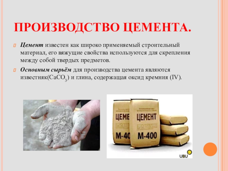 Основным сырьём для производства цемента являются известняк(CaCO3) и глина, содержащая оксид кремния (IV).