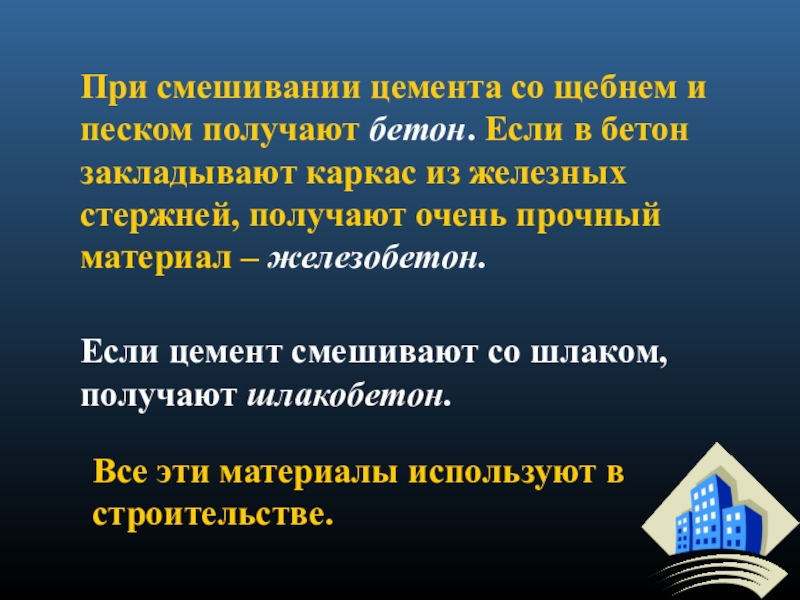 Если цемент смешивают со шлаком, получают шлакобетон.