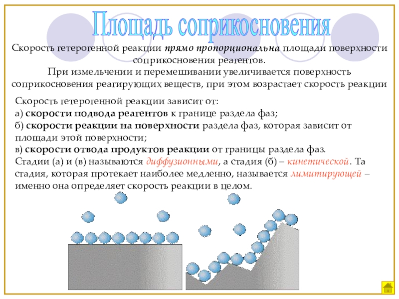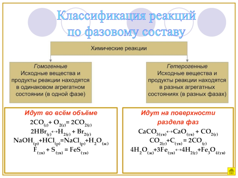 Идут во всём объёме2СО(г)+ О2(г)= 2СО2(г)2HBr(г)↔H2(г) + Br2(г)NaOH(р)+HCl(р)=NaCl(р)+H2O(ж)F(тв) + S(тв) = FeS(тв)Идут на поверхности раздела фазCaCO3(тв)↔CaO(тв) +