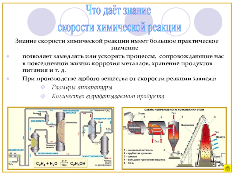 Знание скорости химической реакции имеет большое практическое значениепозволяет замедлять или ускорять процессы, сопровождающие нас в повседневной жизни: