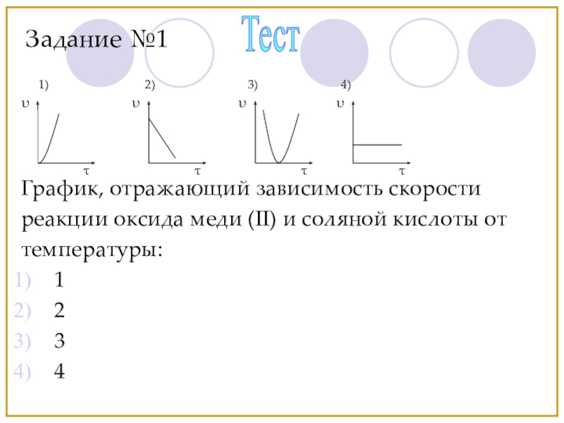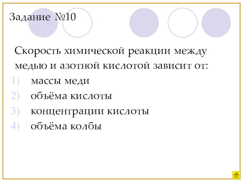 Скорость химической реакции междумедью и азотной кислотой зависит от:массы медиобъёма кислотыконцентрации кислотыобъёма колбыЗадание №10