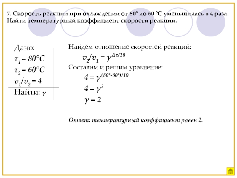 При увеличении температуры от 10° до30° С скорость реакции, температурныйкоэффициент которой γ = 3:возрастёт в 3 разавозрастёт