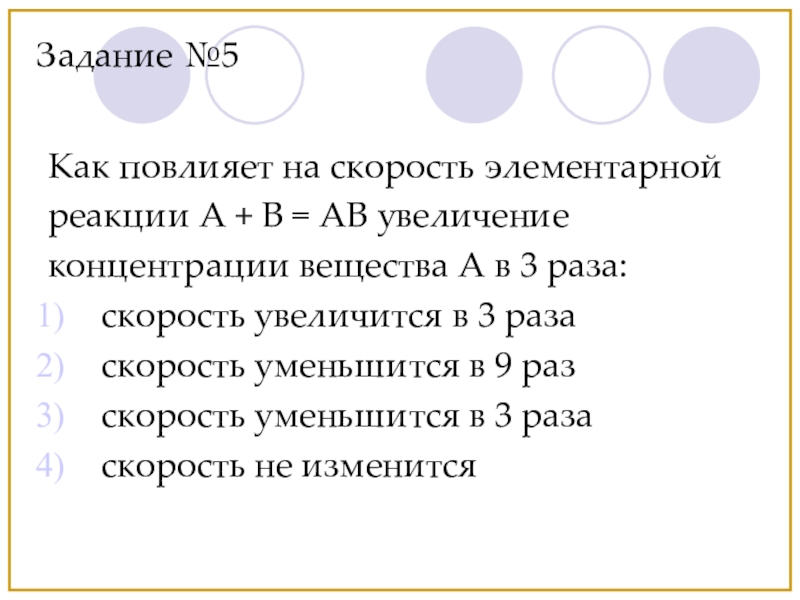Задание №2Какой из факторов не оказываетвлияния на скорость химическойреакции в растворах:концентрация веществиспользование катализатораиспользование ингибитораобъём реакционного сосуда
