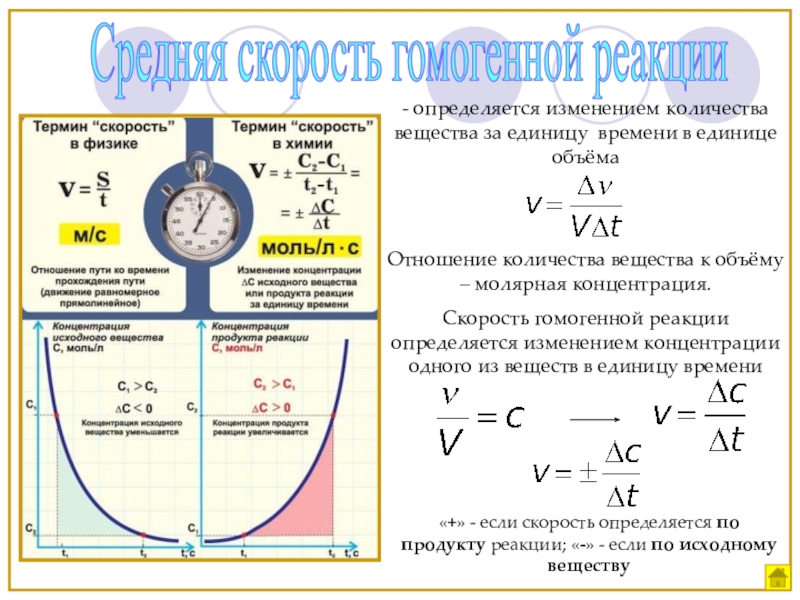 Средняя скорость гомогенной реакции- определяется изменением количества вещества за единицу времени в единице объёмаОтношение количества вещества к