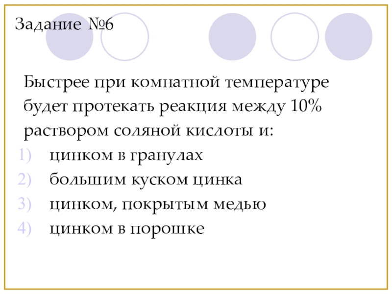 Быстрее при комнатной температуребудет протекать реакция между 10%раствором соляной кислоты и:цинком в гранулахбольшим куском цинкацинком, покрытым медьюцинком