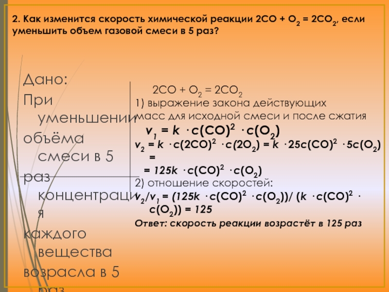 2. Как изменится скорость химической реакции 2СО + О2 = 2СО2, если уменьшить объем газовой смеси в 5 раз?