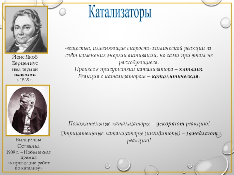 вещества, изменяющие скорость химической реакции за счёт изменения энергии активации, но сами при этом не расходующиеся. Процесс в присутствии катализатора – катализ. Реакция с катализатором – каталитическая.
