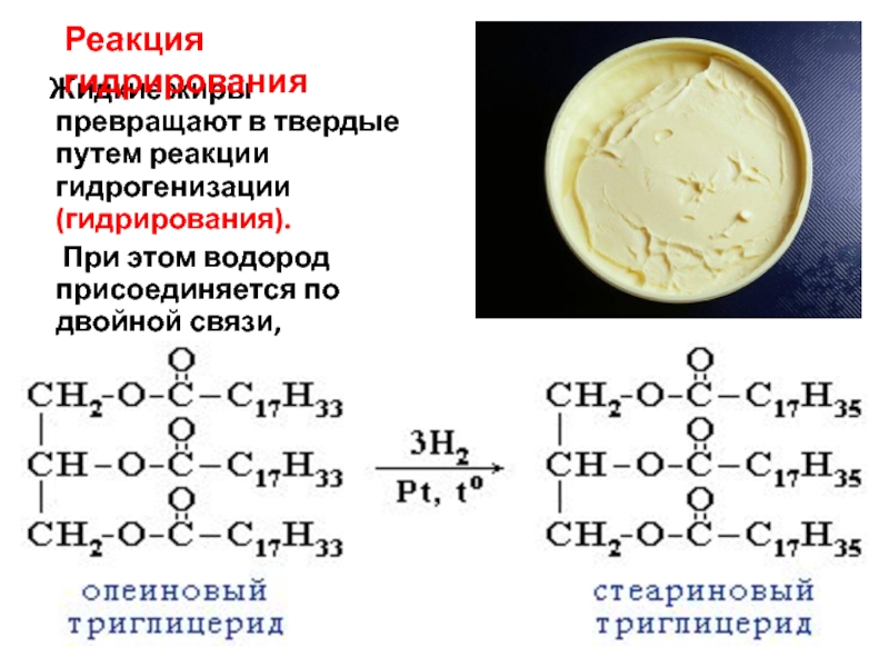 Слайд 21 Жидкие жиры превращают в твердые путем реакции гидрогенизации (гидрирования).