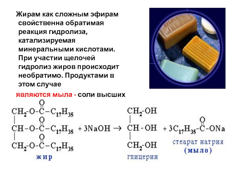 минеральными кислотами. При участии щелочей гидролиз жиров происходит необратимо. Продуктами в этом случае