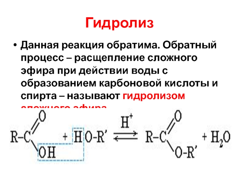 Данная реакция обратима. Обратный процесс – расщепление сложного эфира при действии