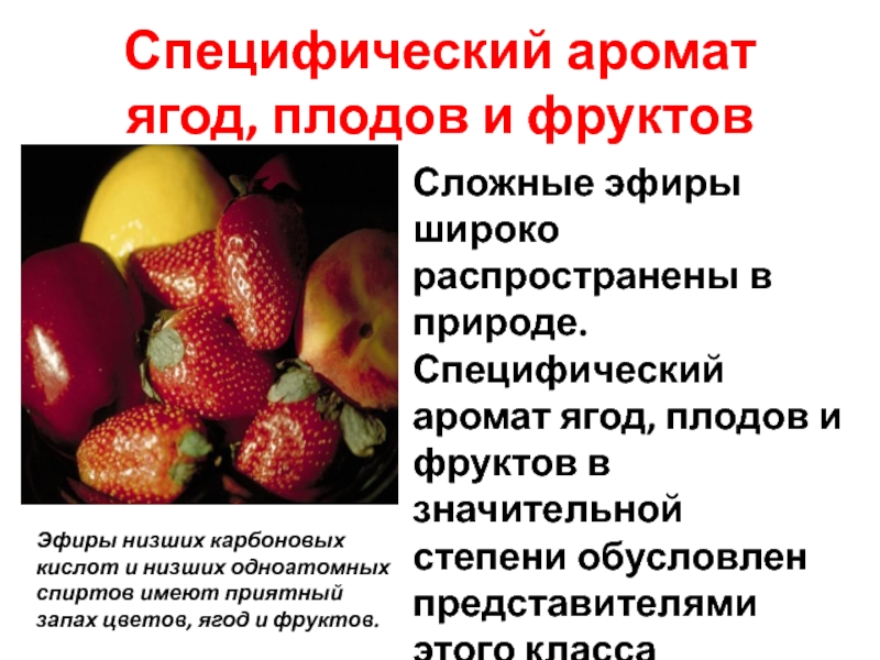Специфический аромат ягод, плодов и фруктов в значительной степени обусловлен представителями этого класса органических соединений.
