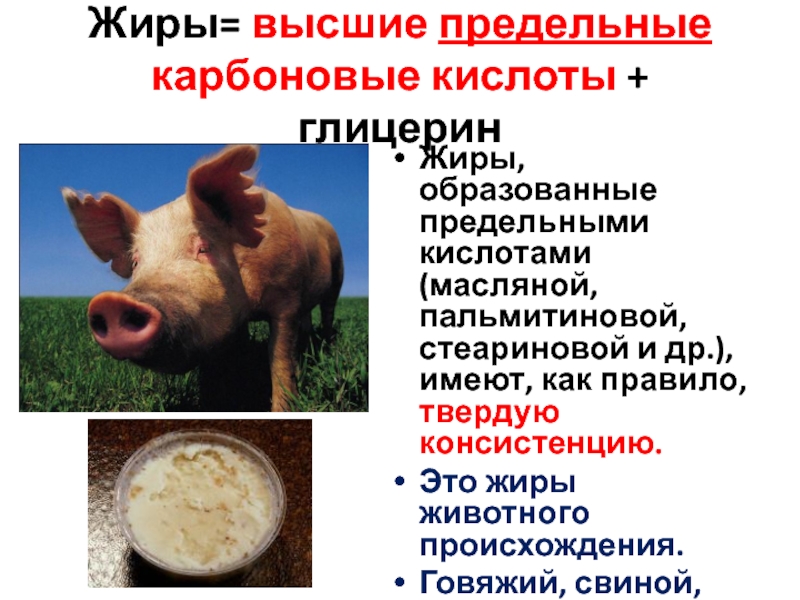(масляной, пальмитиновой, стеариновой и др.), имеют, как правило, твердую консистенцию.