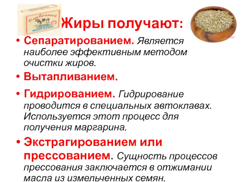 Жиры получают вытапливанием, сепарированием, гидрированием, прессованием или экстрагированием.