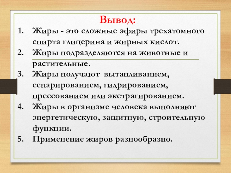 Жиры в организме человека выполняют энергетическую, защитную, строительную функции.