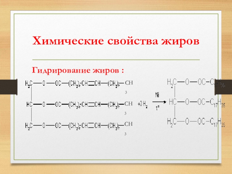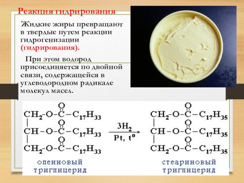 Слайд 20 Жидкие жиры превращают в твердые путем реакции гидрогенизации (гидрирования).