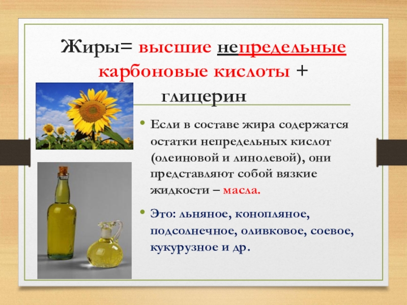 содержатся остатки непредельных кислот (олеиновой и линолевой), они представляют собой вязкие жидкости – масла.