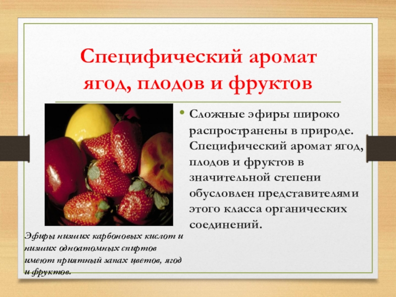 Специфический аромат ягод, плодов и фруктов в значительной степени обусловлен представителями этого класса органических соединений.