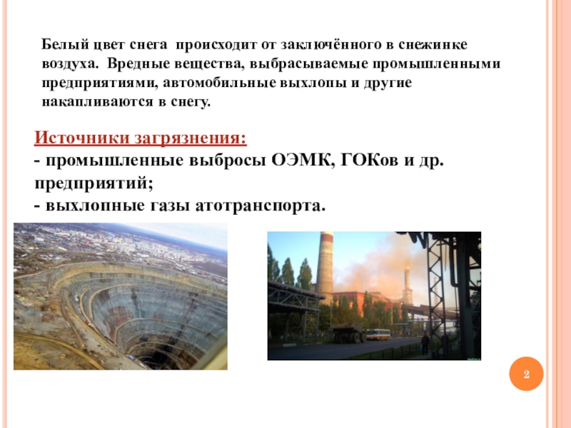 Белый цвет снега происходит от заключённого в снежинке воздуха. Вредные вещества, выбрасываемые промышленными предприятиями, автомобильные выхлопы и другие накапливаются в снегу.
