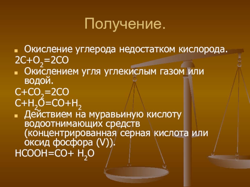Получение.Окисление углерода недостатком кислорода.2С+О2=2СООкислением угля углекислым газом или водой.С+СО2=2СОС+Н2О=СО+Н2Действием на муравьиную кислоту водоотнимающих средств (концентрированная серная кислота