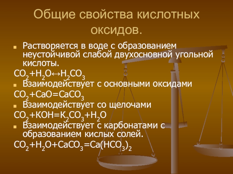 Общие свойства кислотных оксидов.Растворяется в воде с образованием неустойчивой слабой двухосновной угольной кислоты.СО2+Н2О↔Н2СО3Взаимодействует с основными оксидамиСО2+СаО=СаСО3Взаимодействует со