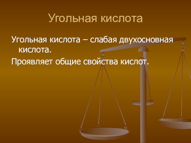 Угольная кислотаУгольная кислота – слабая двухосновная кислота.Проявляет общие свойства кислот.