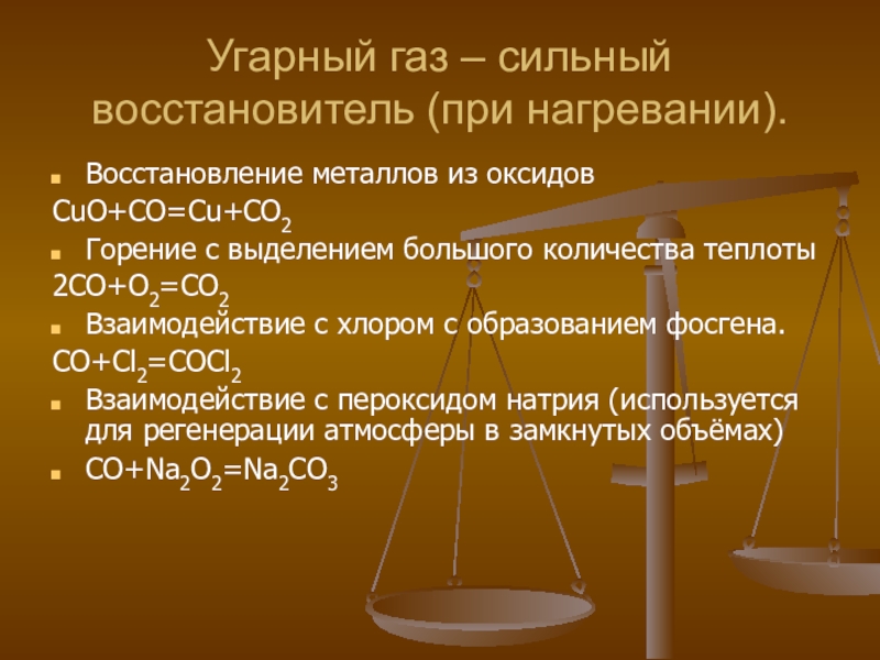 Угарный газ – сильный восстановитель (при нагревании).Восстановление металлов из оксидовCuO+CO=Cu+CO2Горение с выделением большого количества теплоты2СО+О2=СО2Взаимодействие с хлором