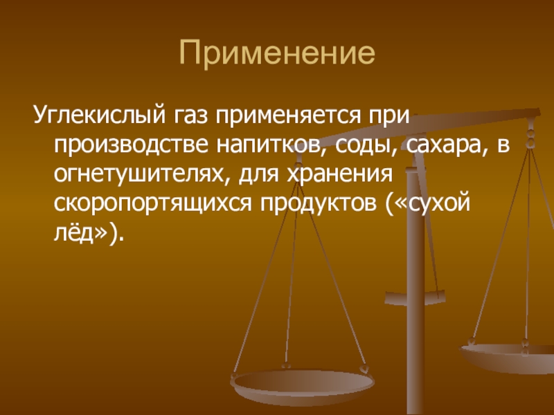 Применение Углекислый газ применяется при производстве напитков, соды, сахара, в огнетушителях, для хранения скоропортящихся продуктов («сухой лёд»).