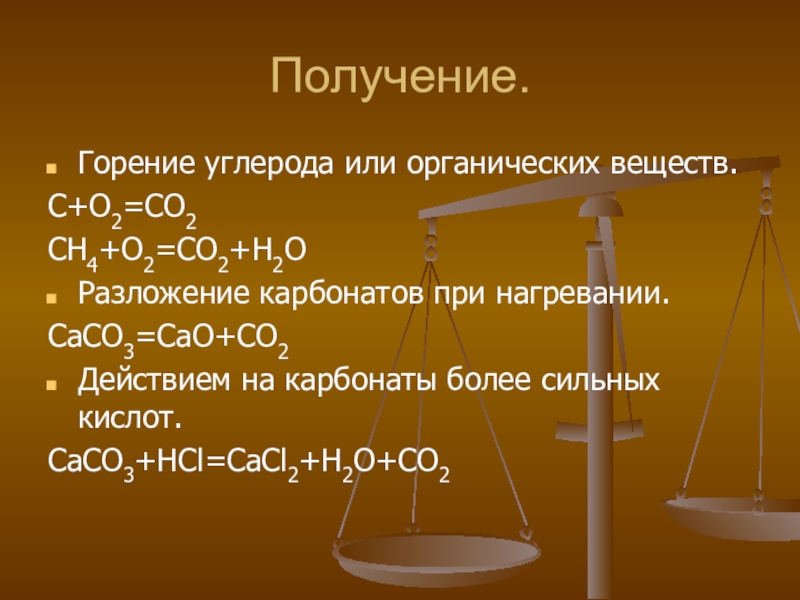 Получение.Горение углерода или органических веществ.С+О2=СО2СН4+О2=СО2+Н2ОРазложение карбонатов при нагревании.СаСО3=СаО+СО2Действием на карбонаты более сильных кислот.СаСО3+НСl=CaCl2+Н2О+СО2