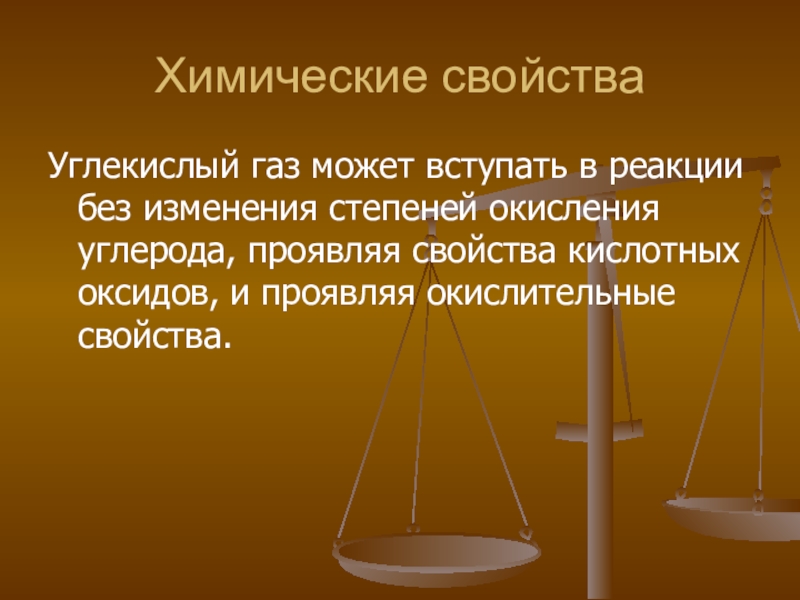 Химические свойстваУглекислый газ может вступать в реакции без изменения степеней окисления углерода, проявляя свойства кислотных оксидов, и