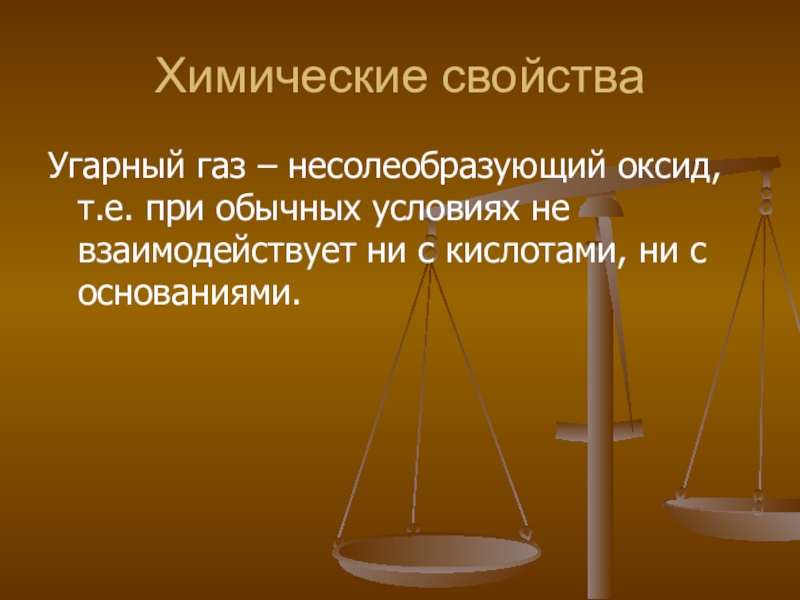 Химические свойстваУгарный газ – несолеобразующий оксид, т.е. при обычных условиях не взаимодействует ни с кислотами, ни с