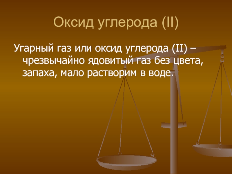 Оксид углерода (II)Угарный газ или оксид углерода (II) – чрезвычайно ядовитый газ без цвета, запаха, мало растворим