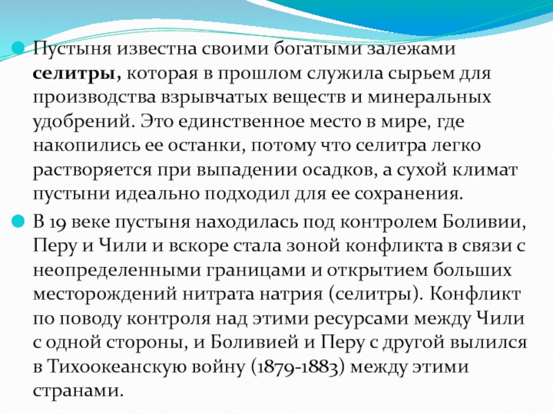 для производства взрывчатых веществ и минеральных удобрений. Это единственное место в мире, где накопились ее останки, потому что селитра легко растворяется при выпадении осадков, а сухой климат пустыни идеально подходил для ее сохранения.