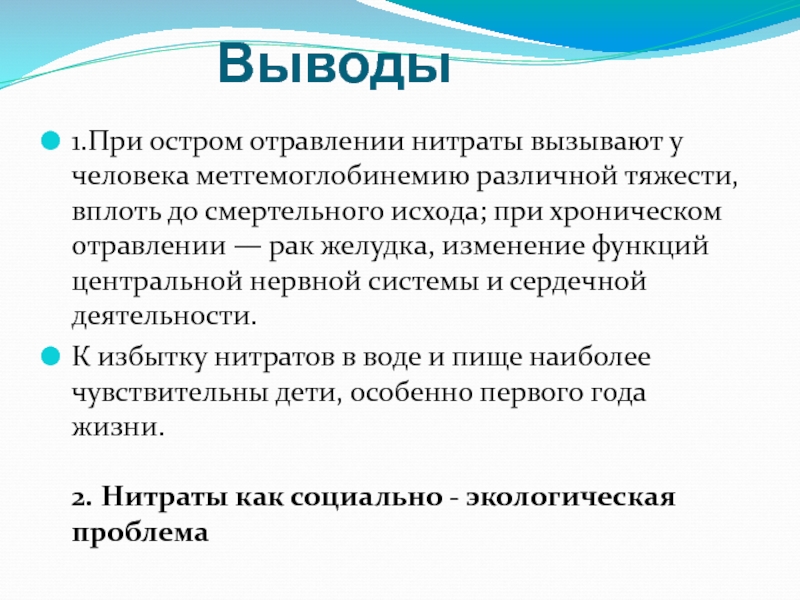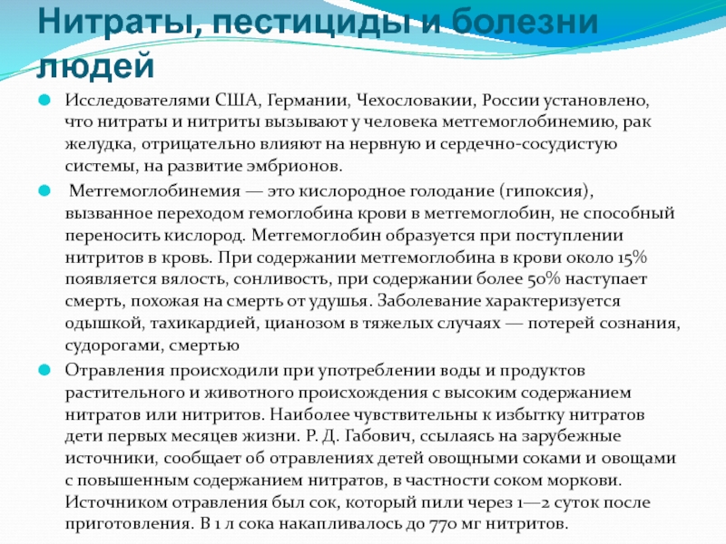 нитраты и нитриты вызывают у человека метгемоглобинемию, рак желудка, отрицательно влияют на нервную и сердечно-сосудистую системы, на развитие эмбрионов.