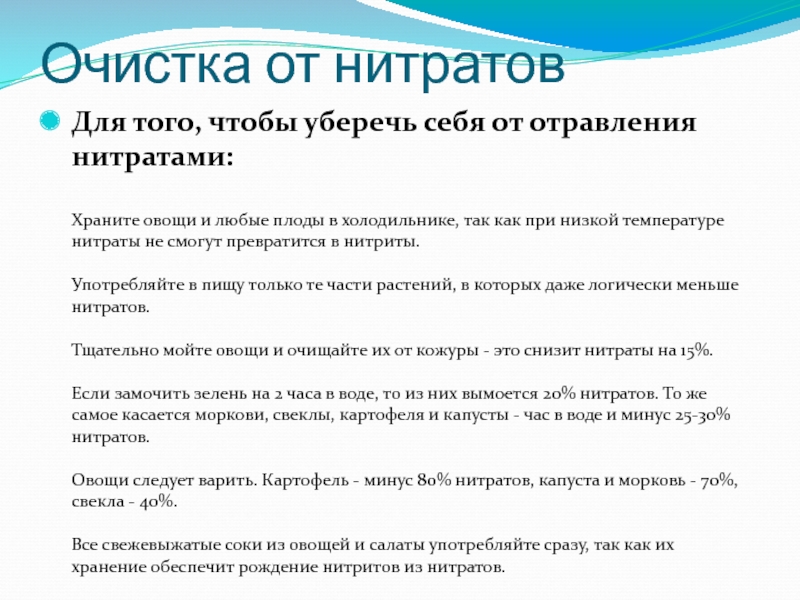 Если замочить зелень на 2 часа в воде, то из них вымоется 20% нитратов. То же самое касается моркови, свеклы, картофеля и капусты - час в воде и минус 25-30% нитратов.