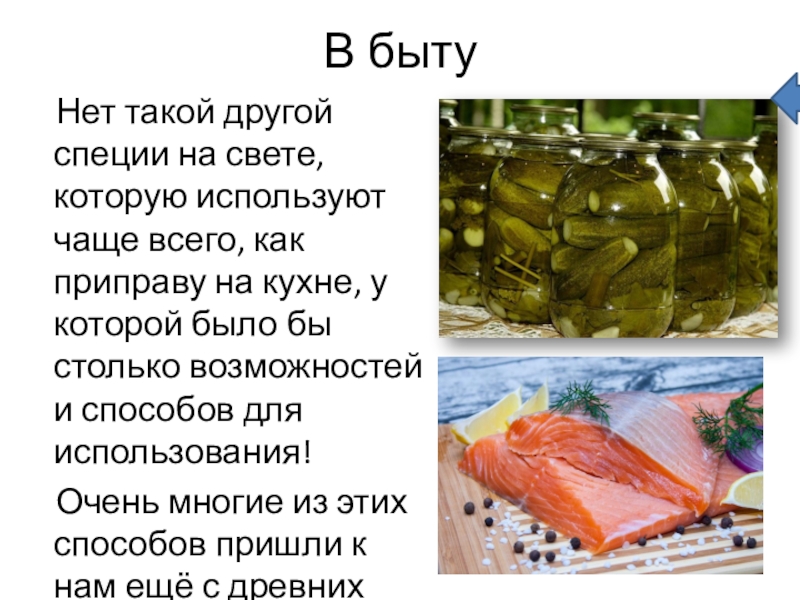 В быту  Нет такой другой специи на свете, которую используют чаще всего, как приправу на кухне,