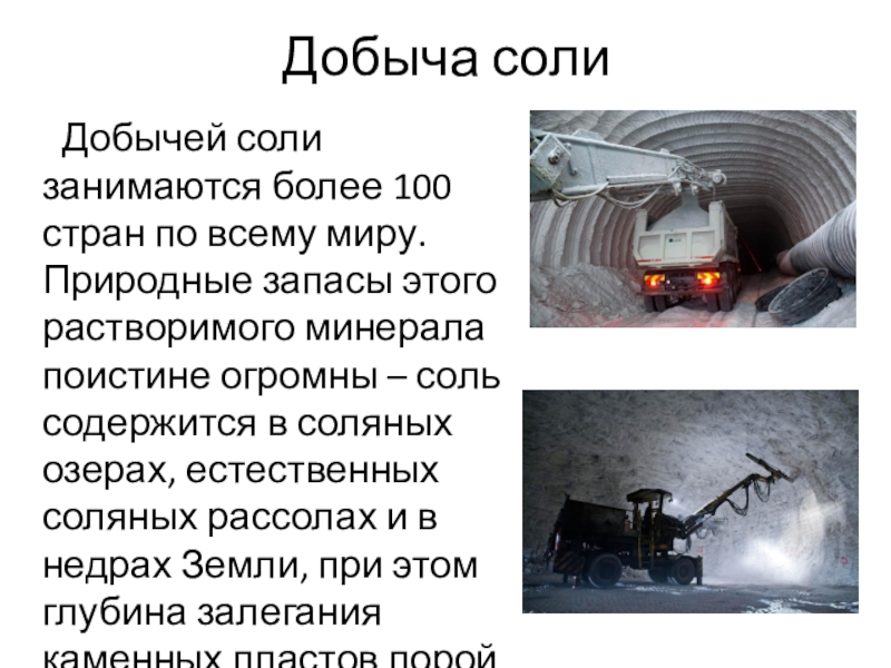 Добыча соли   Добычей соли занимаются более 100 стран по всему миру. Природные запасы этого растворимого