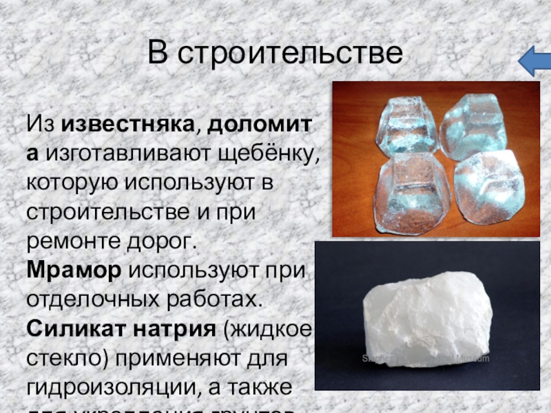 которую используют в строительстве и при ремонте дорог. Мрамор используют при отделочных работах. Силикат натрия (жидкое стекло) применяют для гидроизоляции, а также для укрепления грунтов.