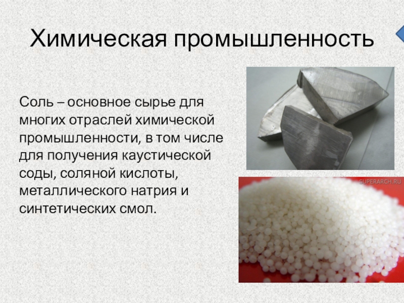Химическая промышленность    Соль – основное сырье для многих отраслей химической промышленности, в том числе