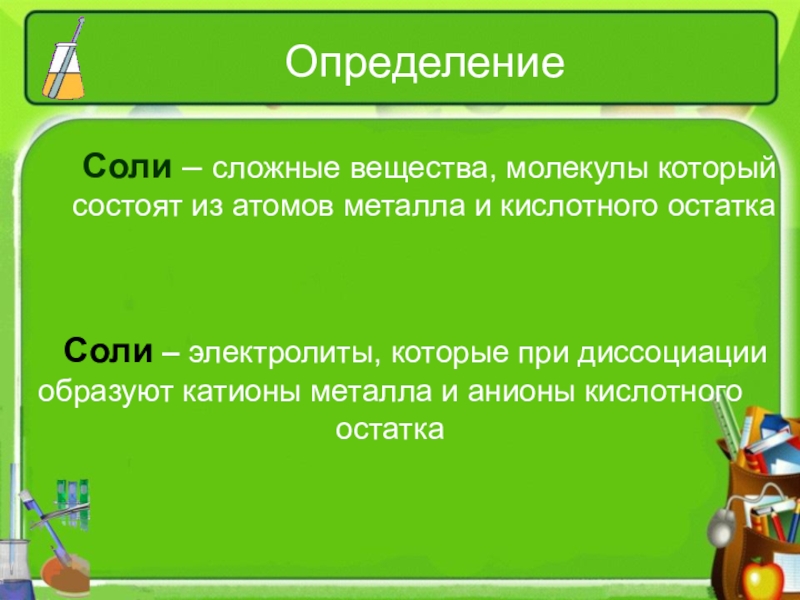 Соли – электролиты, которые при диссоциации образуют катионы металла и анионы кислотного остатка